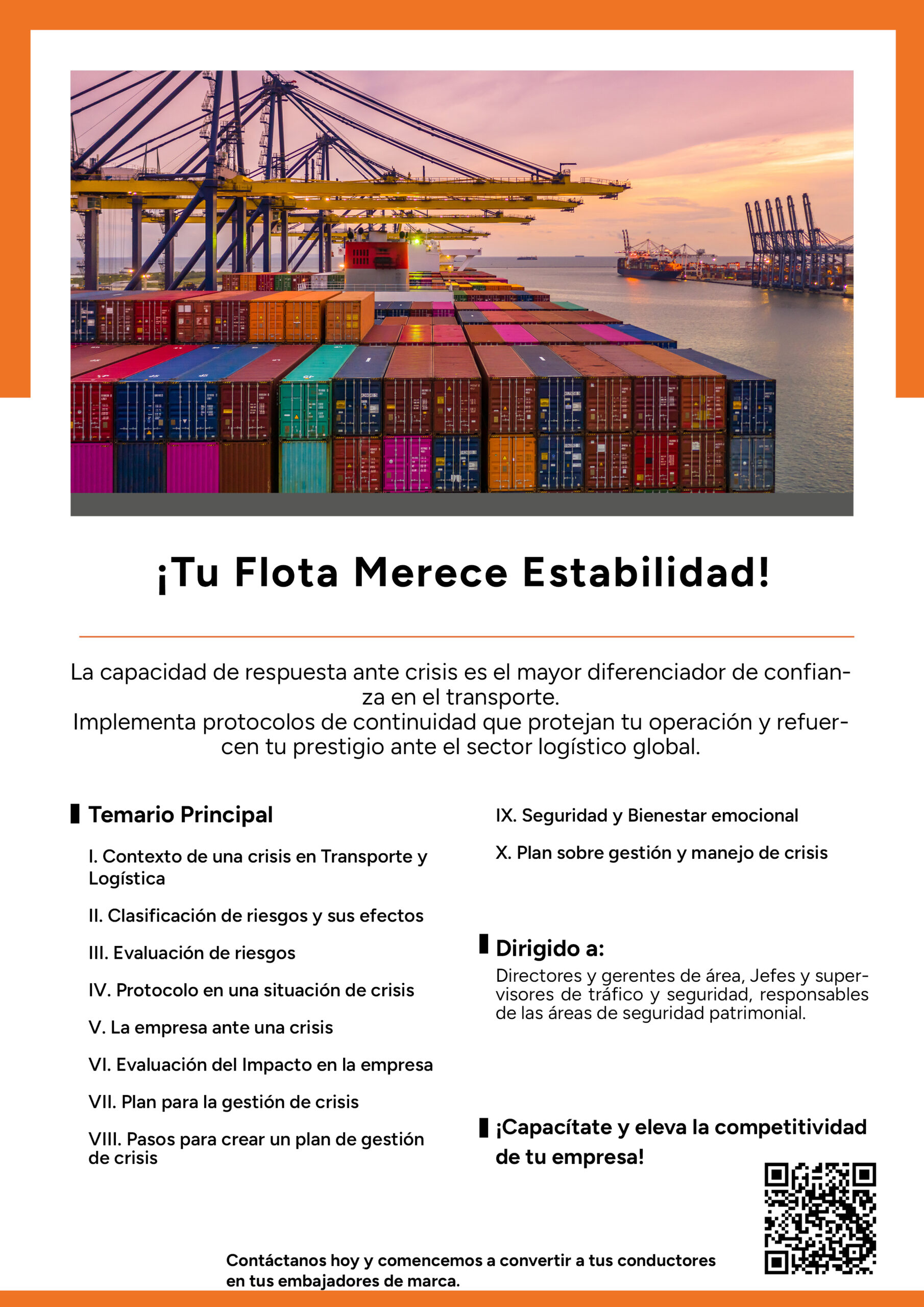 Capacitar a los participantes en el diseño, implementación y ejecución de planes de respuesta ante emergencias y crisis en la cadena de suministro. Al finalizar el curso, el participante dominará las técnicas para evaluar la gravedad de un incidente en tiempo real, liderar comités de crisis eficientes, minimizar los daños económicos y operativos, y restablecer la normalidad del servicio en el menor tiempo posible.