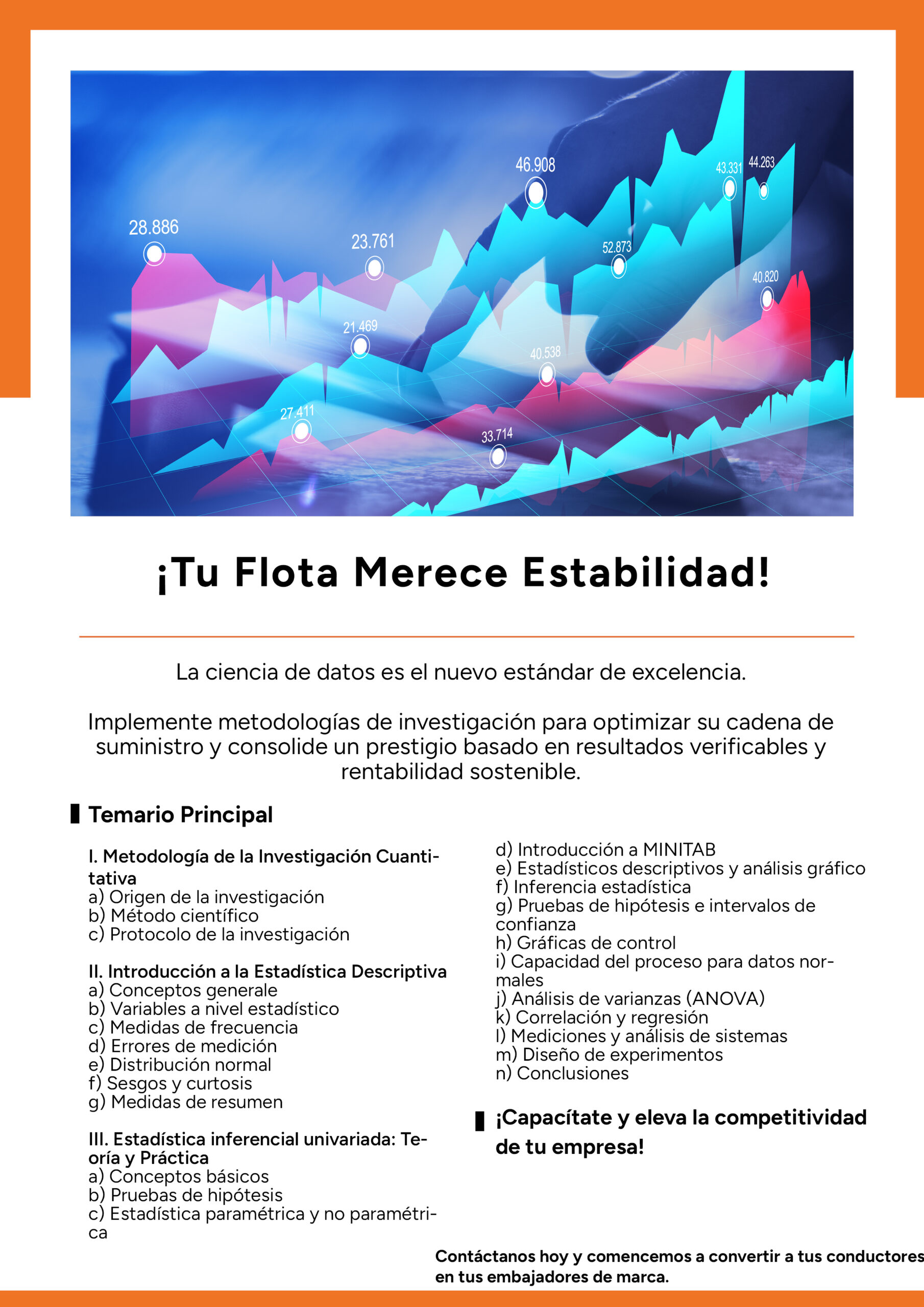 Desarrollar en los participantes las competencias necesarias para plantear, diseñar y ejecutar proyectos de investigación aplicada utilizando herramientas estadísticas avanzadas. Al finalizar el curso, el participante será capaz de formular hipótesis de negocio, determinar el tamaño de muestra adecuado, aplicar pruebas estadísticas para validar resultados y presentar conclusiones científicamente sustentadas que impulsen la mejora en la toma de decisiones organizacionales.