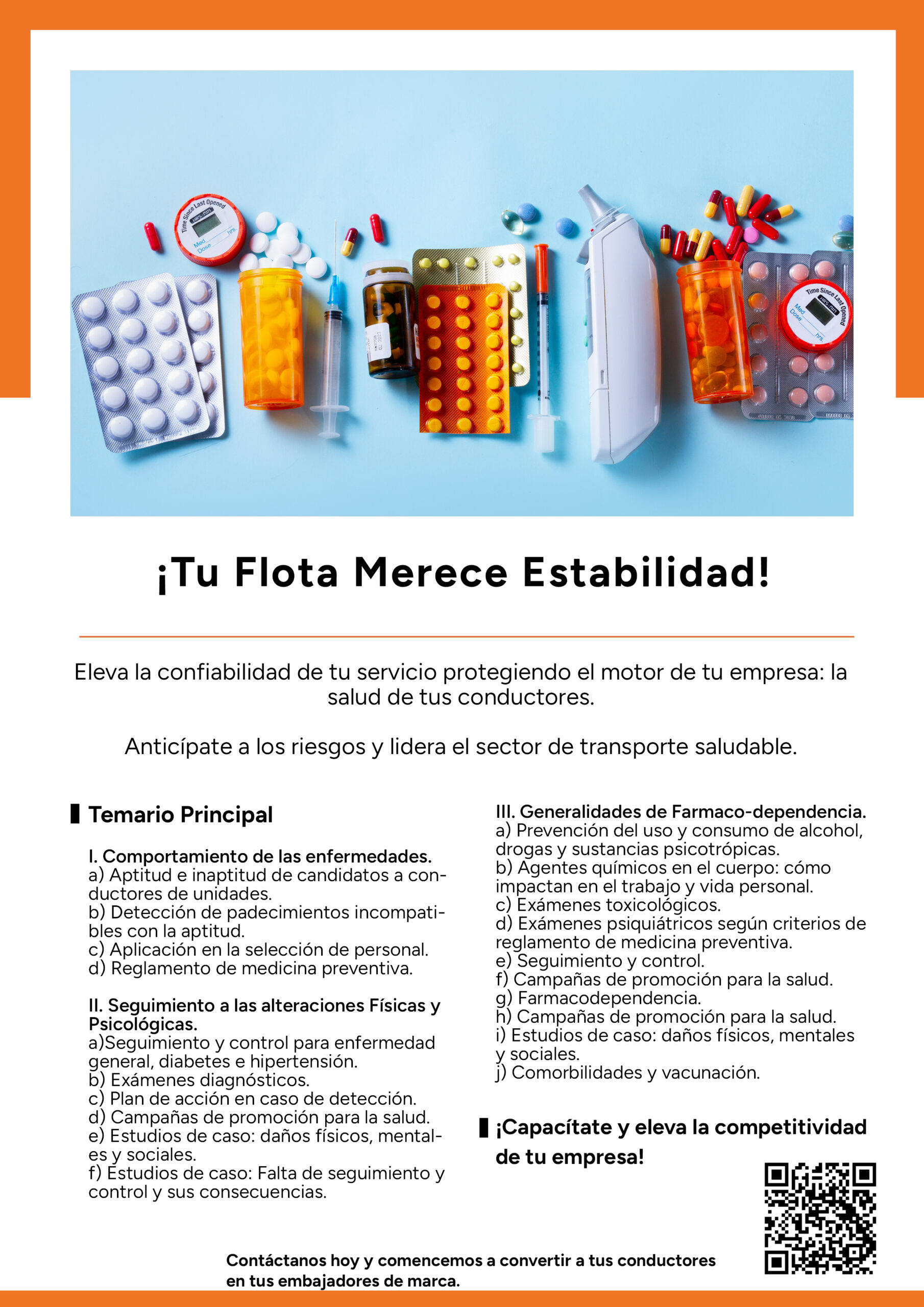Establecer un marco de referencia para la gestión de la salud ocupacional y la medicina preventiva dentro de las empresas de transporte. El curso tiene como propósito capacitar al personal en la detección oportuna de padecimientos crónicos, el control de la fatiga y la prevención de adicciones, logrando así reducir el ausentismo, evitar accidentes viales y cumplir cabalmente con las regulaciones oficiales de aptitud psicofísica.